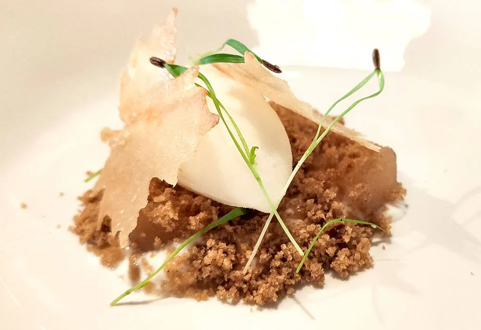 Después de este festín es el turno de los postres. En este menú hay dos. El primero es yogur, pera osmotizada e hinojo. Muy suave y muy ligero para limpiar la boca. El segundo, chocolate, naranja y albahaca, un plato en el que conjugan un sorbete de de helado de chocolate, yogur y galleta de naranja, mousse de chocolate cocida, bizcocho seco de naranja y el toque de la albahaca. Igualmente ligero y apto para quienes no aman demasiado el azúcar al final de una comida.Si prefieres comer a la carta, vas a encontrar otras propuestas además de estas, como, por ejemplo, la lubina soasada con aliño de lima y soja, o la paletilla de cochinillo, asada deshuesado y con hoisin picante y verduras encurtidas.