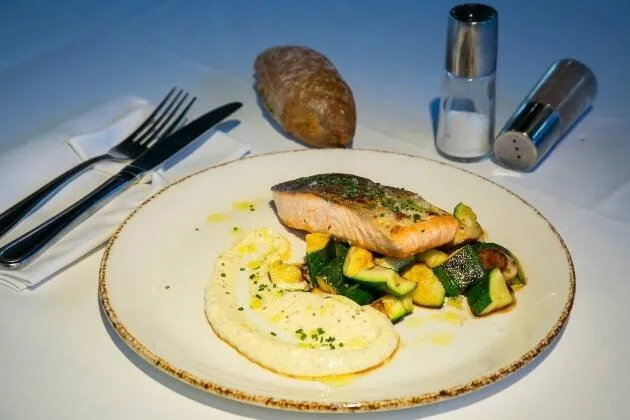 Para los amantes del pescado, el plato estrella de Casa Carmen es el salmón a la plancha con salteado de verduras y setas y salsa tártara. Una propuesta que suele estar en el menú diario de lunes a viernes, que incluye varios primeros y segundos a elegir, postre, pan y bebida. Cuesta ente 12 y 13 euros y "lo cambiamos a diario", precisa Ruggiero, quien también nos habla de los 3 menús de grupo que tienen. "Están disponibles de lunes a domingo, a partir de 2 personas, y cuestan entre 22 y 32 euros" (el precio medio de la carta, por persona, es de unos 20€). Siguiendo con la oferta marina, además del salmón, el bacalao es otro de los pescados protagonistas. Lo preparan acompañado de puré de patatas y compota de cebolla, pasas y miel o con pisto y alioli gratinado.