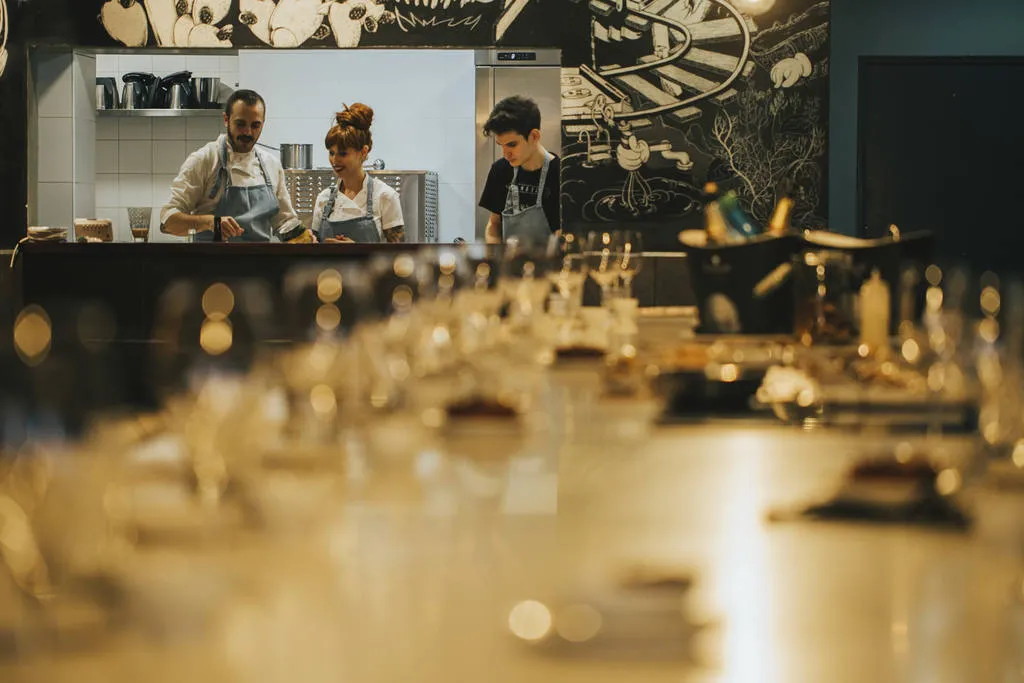 La identidad de esta pareja de chefs impregna el ambiente. Nada más poner un pie en el restaurante, una es consciente de que la música, la iluminación y la decoración son toda una declaración de intenciones. Hay una enorme barra de punta a punta del espacio que hará las veces de escenario. Alrededor de ella, taburetes negros con los respaldos pintarrajeados donde nos sentamos los comensales, que somos también público. Allí, ante las 60 bocas que, como mucho, pueden disfrutar de un mismo pase, Aridana, Pau y su equipo cocinan, emplatan, explican y tararean. Platos, canciones, buen rollo.