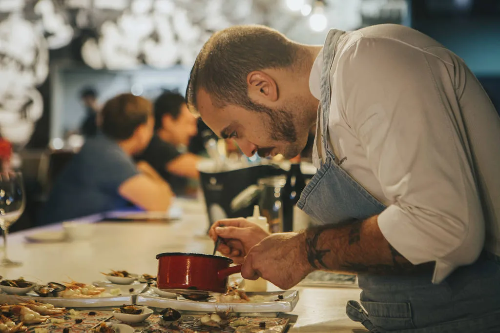 Ariadna le da soplete a la piel de los lomos de un salmonete de roca justo delante de mis narices, la barra se ilumina en azul —ha estado cambiando de color con cada plato— y suena 'Mediterráneo' de Serrat. Sonrío porque soy isleña y el mediterráneo es mucho más que mar para los que nacimos en sus orillas, así que me subo las mangas del vestido y disfruto de mojar el pescado en el intenso puré de coliflor que le acompaña.