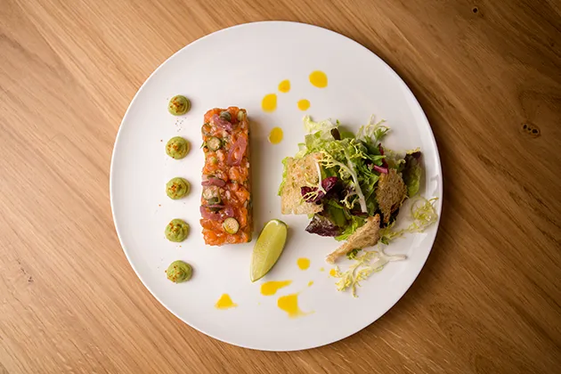 Sin embargo, preferimos la oferta del mediodía, cuando la oferta es la de una brasserie tradicional. Se pierde la formalidad de las noches, con las mesas sin mantel y servilletas de papel (una plaga a la que se ha sumado esta Maison). Se empieza muy bien, con un estupendo pan casero y mantequilla de Isigny. Del capítulo de entradas probamos un buen tartar de salmón con guacamole casero y vinagreta de maracuyá. Sobra un exceso de lechugas, algo que se repite en casi todos los platos. Hay una tendencia a recargar de ingredientes esos platos. Así, a unas buenas verduras marinadas (pimiento, berenjena, calabacín y alcachofas) se les incorpora burrata y queso curado que no aportan nada. Está rica la ensalada landesa, con magret y mollejas confitadas de pato, piñones, rúcula, costrones de pan y una vinagreta de pedro Ximénez, más, otra vez, demasiadas lechugas mezclum. Eso sí, la ración es muy abundante, casi un plato único. En este capítulo de ensaladas, interesante la César, bastante tradicional, con el pollo rebozado en panko.