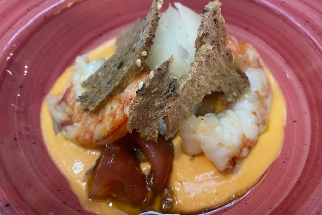 De los entrantes, destaca la ensalada de tomate rosa de Barbastro con gambones a la brasa y queso ahumado sobre salmorejo: un plato rico, pero donde puede notarse ese exceso de ingredientes del que hablaba. También ocurre en un buen tartar de atún rojo de Balfegó con huevo frito y huevas de mújol, al que le sobra una mantequilla ahumada que anula parcialmente el sabor del atún.