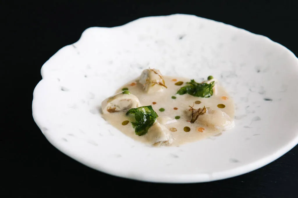 Tras la anguila, una explosión yodada con el trío de moluscos: Primero pasan las Ostras y ostras; luego las almejas en Jerez, y finalmente el Ramen de mejillones, con fideos de mar en un reconfortante caldo thai, con mimético de mejillón.