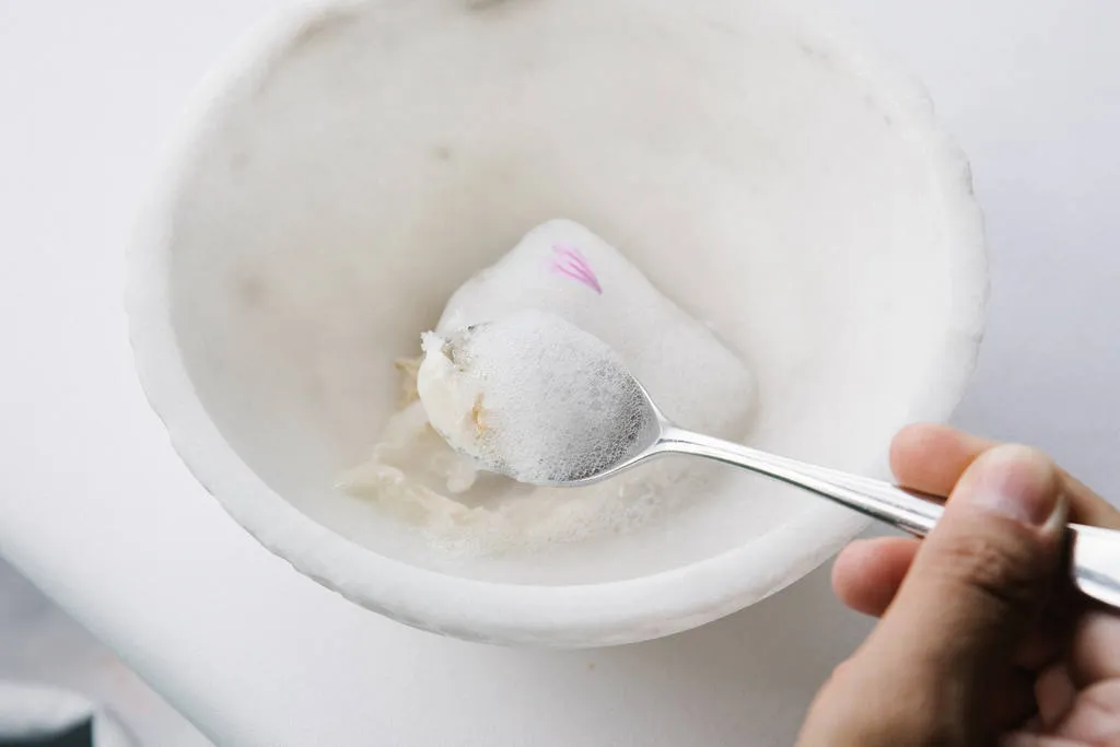 En la transición, antes de dar entrada al trío de carnes, llegan dos platos muy refrescantes: Almendruco, chufas y malvas, y el Burrapesto, con burrata, piñones hidratados, polvo nitro de pesto, aceite y sal.