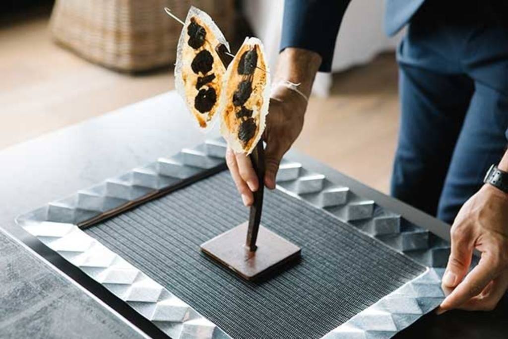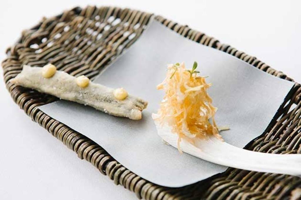 Le sigue el plato más contundente de sabor: Anchoa y trufa, donde muestra tres técnicas de cocción: brasa, salazón y fermentación, con el destacado sabor a umami. Llega en un colgador como si estuviera secando al aire o al sol. Es tan potente que el retrogusto es muy duradero.