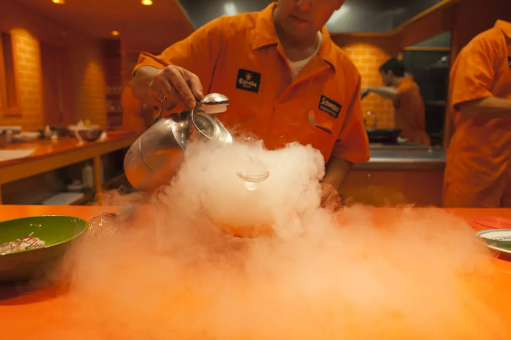La decoración, en un naranja intenso, con mesas sobre raíles para configurar fácilmente espacios flexibles, y pinturas en las paredes, confiere un aire moderno al local. Pero lo que hace de Nobook un lugar especial es el hecho de que la cocina sea abierta totalmente y uno pueda ver la frenética evolución de los platos.