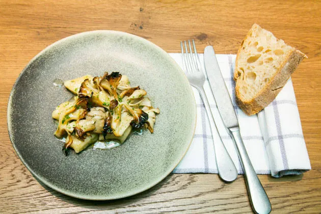 Es el caso de la escalibada de pimiento rojo, que regala a nuestras papilas gustativas el inconfundible sabor de la brasa, y que Ludwig riega con una vinagreta de aceituna negra y un poco aceite de tomate seco triturado. O del hongo maitake, utilizado en la medicina tradicional oriental por sus beneficios para el sistema inmunológico, y que en la gastronomía destaca por su sabor intenso y peculiar. Pasado por el carbón, el hongo se acompaña con unos ñoquis elaborados a mano por el chef y emulsionados con una salsa de mantequilla y limón.