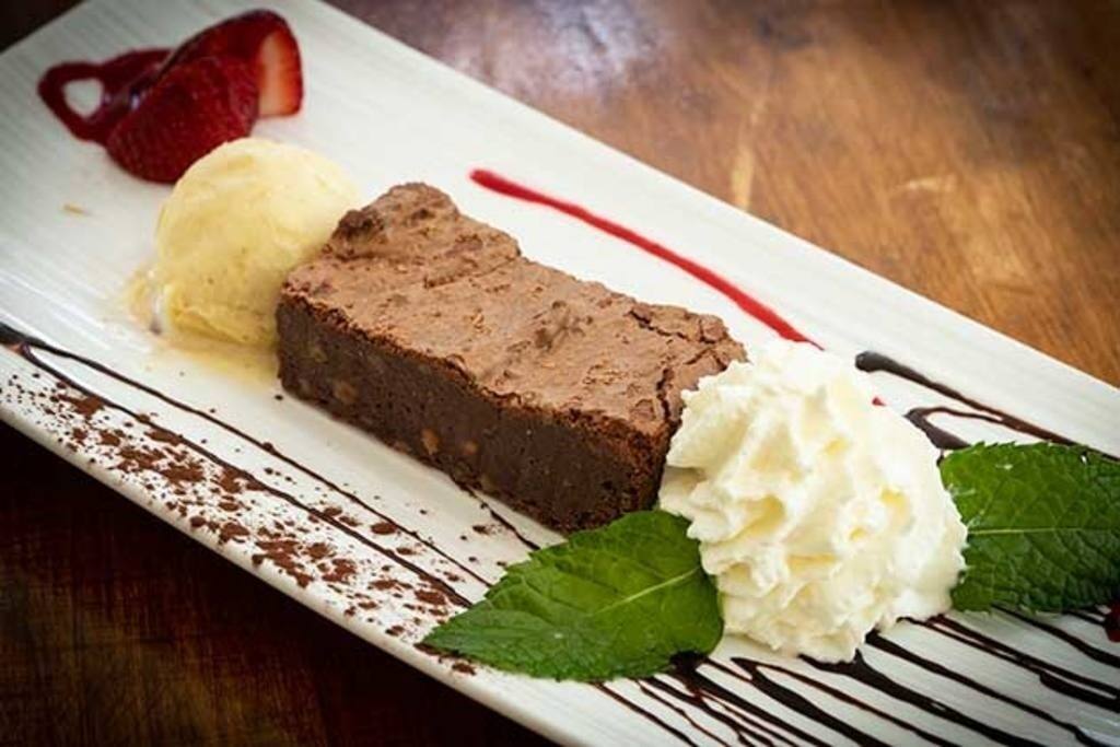 Entre los postres, destacan pasteles caseros como el brownie de chocolate y nueces, el tiramisú o la panacotta con puré de mango. También hay propuestas más refrescantes como el sorbete de limón al cava o el helado de turrón con ratafía Rosset.