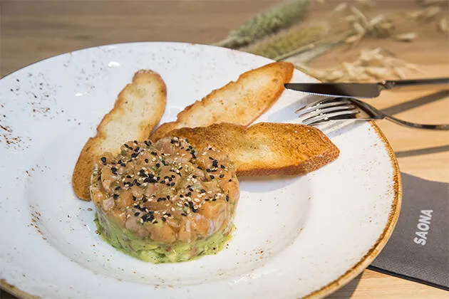 Los platos principales también seducen desde el primer momento. Entre sus propuestas se encuentra el tartar de salmón con aguacate marinado en salsa de lima y soja, acompañado por unas tostas, como también el pulpo sobre alioli de patata, aceite de pimentón y crujiente de jamón. En clave carnívora, no faltan platos como el solomillo de pollo con camembert, patatas a lo pobre y jamón ibérico, la hamburguesa Saona o la lasaña de carne. Los arroces, presentados en una original bandeja rectangular, son otro de sus puntos fuertes. Sirven dos versiones de arroz en llanda: una con costilla ibérica, longaniza y garbanzos, y otra, con alioli de ajo asado.