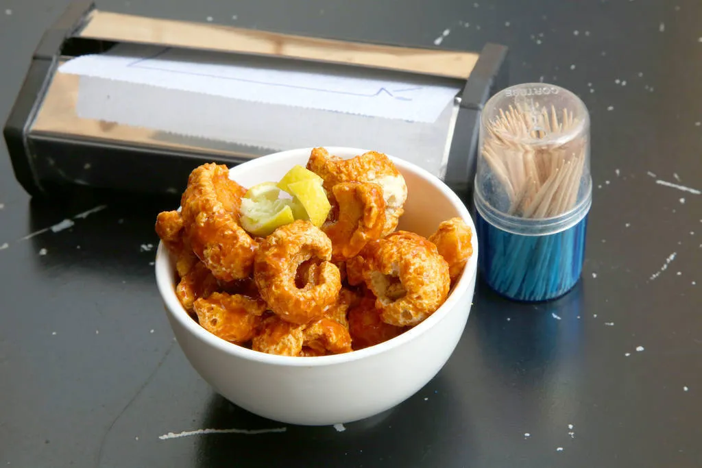 También reversionan las patatas bravas, que construyen con chips de calidad, decoran con unos trocitos de piparra y sazonan con dos salsas: una de chipotle y la otra a base de menta y crema agria. Su contraste entre fresco y picante convence. Lo mismo con las cortezas, que aquí hacen pareja con la salsa Valentina y el jugo de lima. La inspiración mexicana es evidente. Las olivas también se transforman y las marinan ellos mismos con vermut, especies y naranja.