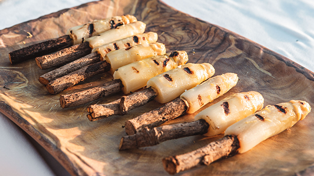 La bienvenida a esta fiesta gastronómica sin precedentes en la isla nos la dio una Rosa blanca, uno de los míticos snacks de Tickets, esta vez versionada con los aromas de la cerveza que hizo posible que los astros se alinearan en Palma. Y, con ella en la mano, entramos en una especie de limbo. La música en directo sonaba como si formáramos parte de una película de única emisión, como si los aperitivos, el maridaje, el ambiente, los instrumentos y el entorno hubiesen estado siempre listos para encontrarse justo allí, en ese preciso instante, con el objetivo de sacudir nuestros sentidos de una manera sublime.