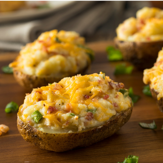 Patatas rellenas de champiñones y ajos tiernos con virutas de bacon salteado