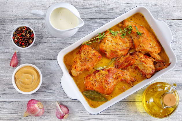 Precalienta el horno a 180°C y engrasa ligeramente una bandeja para horno. En un bol, mezcla la mostaza Dijon, el vinagre de vino blanco, el aceite de oliva y el ajo picado hasta obtener una salsa uniforme.