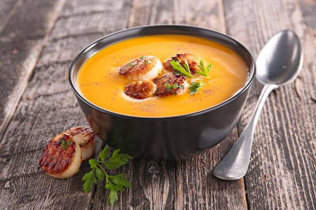 - Corta la carne de vieira longitudinalmente, para que de cada vieira salgan dos piezas. Pásalas por una sartén con un poco de mantequilla hasta que cojan un bonito color dorado. Sazona con sal y pimienta y sírvelas en el último momento con la crema.