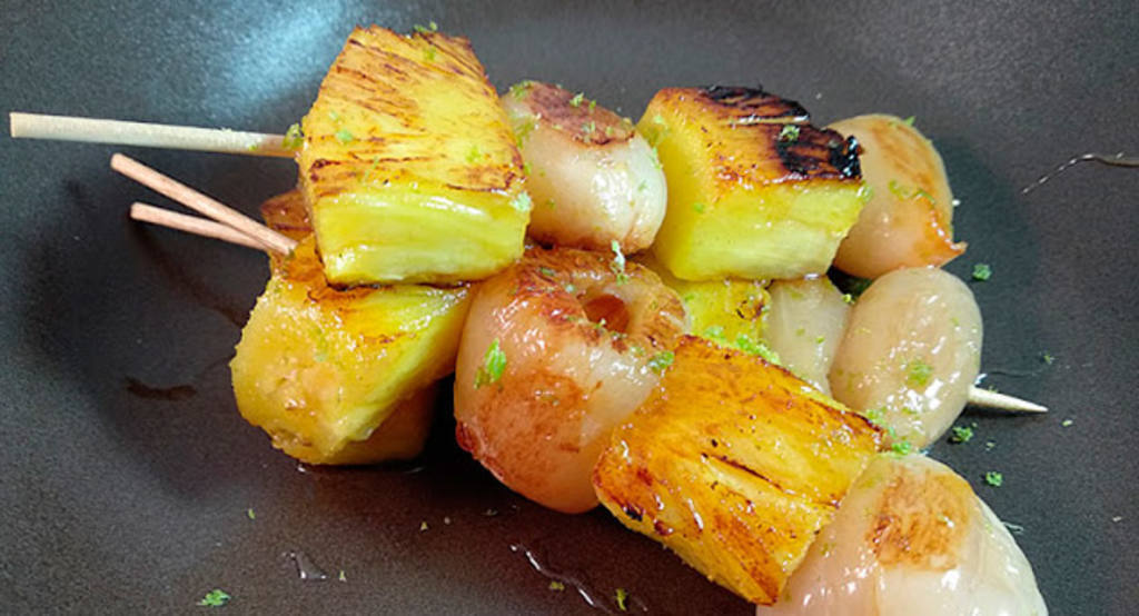 Cortamos la piña en tacos sin la piel, ensartamos en brochetas la piña con los lichis y mientras tanto ponemos la mantequilla en una sartén a calentar. Cuando esté caliente doramos las brochetas y acabamos con ralladura de la lima para aromatizar.