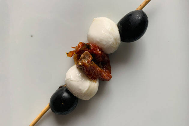 Esta banderilla es mas moderna, pero podría encontrarse en una barra de pintxo tranquilamente por el aspecto tradicional que tiene. Es una combinación de inventos italianos, como la mozzarella y riquísimos tomates secos. La aceituna negra le da otro aire. Además, ¡está muy rico!