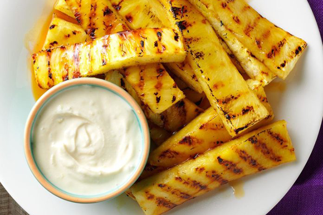 Calentar la plancha o parrilla con un poco de aceite y asar los trozos de piña por cada lado hasta que estén dorados. Servir acompañados con la salsa de lima.